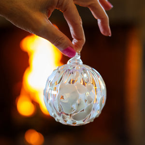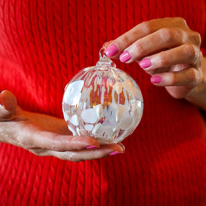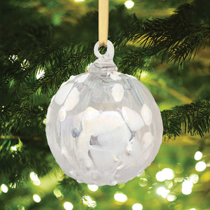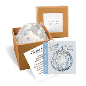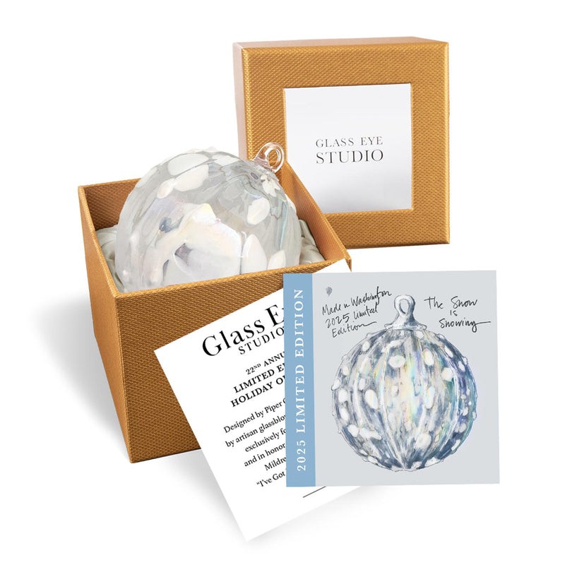 As snowflakes drift through silvery skies and icicles form along windowsills, this handblown glass ornament captures the hush and shimmer of a Washington winter. Soft white tufts drift across its translucent surface like a snowfall in slow motion—quiet, ethereal, and full of wonder.