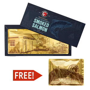 Your Northwest style smoked salmon arrives in SeaBear's award-winning gift box. Each salmon fillet is vacuum-sealed in SeaBear's famous Gold Seal pouch, then gently cooked in it's own juices — this preserves the salmon naturally, so no refrigeration is need until opened, making it perfect for sharing as a gift.
