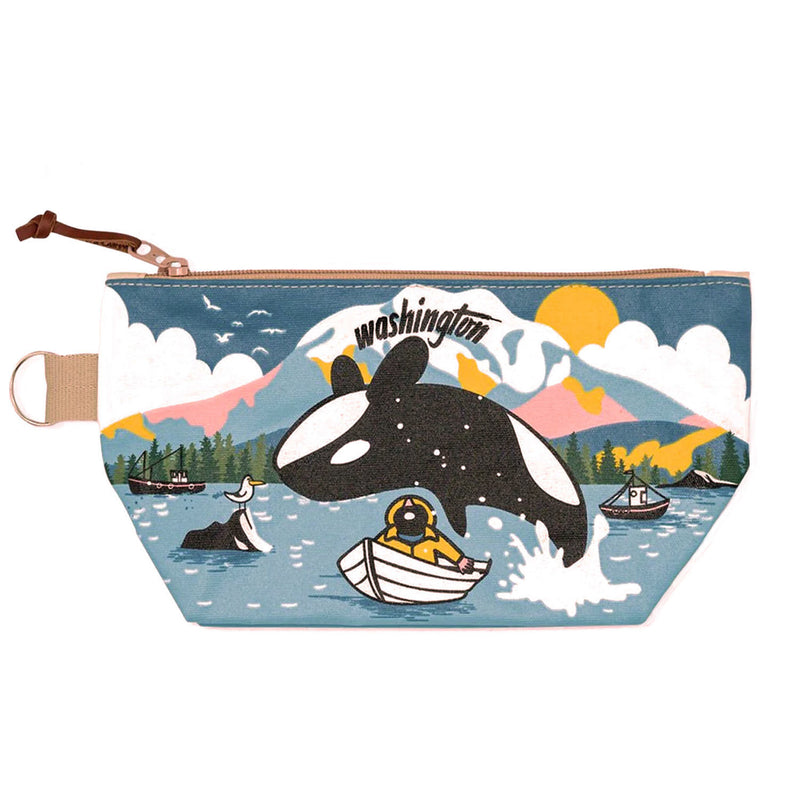 Delightful travel pouch reflecting the Washington state of mind (to locals as well as travelers) by Chalo. This multi-use pouch features a whimsical screen printed illustration of an Orca Leaping over a fisherman in a boat on the exterior.