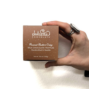 Handcrafted with the finest chocolate and creamiest filling. Indulge in a box of 12 peanut butter crisp truffles coated in cocoa powder. 4 oz. total weight.