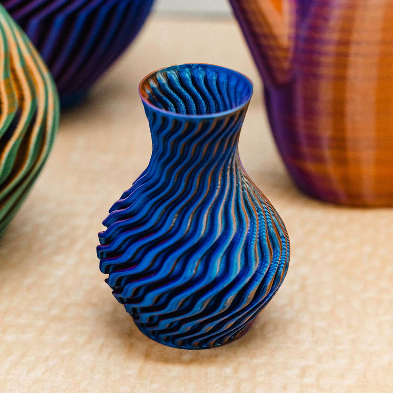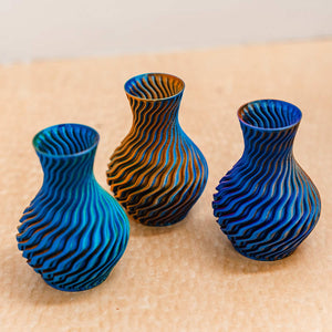 The Dragon Mini Bud Vases feature a unique design that marries modern aesthetics with playful charm. Their petite dimensions make them ideal for presenting delicate floral arrangements or single stems, enhancing the elegance of any tabletop or display area. Explore the charm of the Dragon Mini Bud Vases and elevate your display with their artistic flair. Crafted using three distinct colors fused into a single strand, the captivating colors of the piece change as you turn it or view it from a different angle.