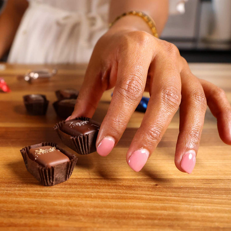 - 10 Gray Salt Caramel - Slow-cooked, soft butter caramel is dipped in 70% dark chocolate and finished with a sprinkling of gray sea salt harvested off the coast of Brittany.