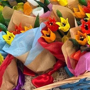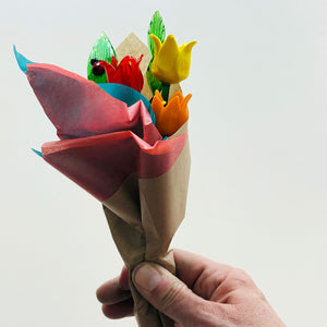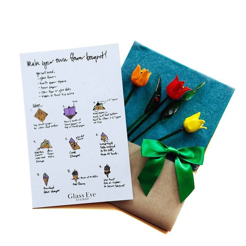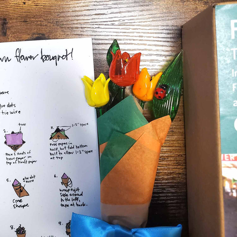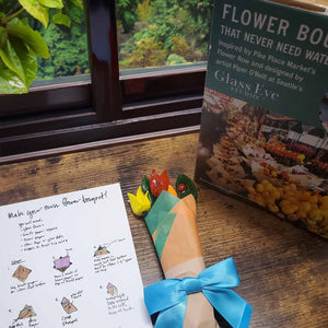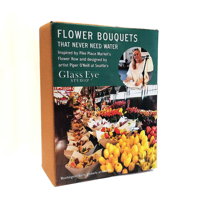 Inspired by Pike Place Market's famed Flower Row and designed in Seattle by Glass Eye Studio's Piper O'Neill, this cheerful floral bouquet doesn't need water, just needs a little sunlight to make it come to life! Each tulip bouquet includes a yellow, red, and orange open bloom and two leaves (one even with a friendly ladybug!). Wrap your everlasting flower bouquet just like they do at Pike Place Market.