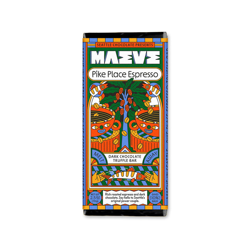 Pike Place Espresso is a Maeve classic - a deliciously deep dark chocolate truffle bar infused with bold decaffeinated espresso, roasted less than 2 miles from Maeve's factory. Wow, guess it was meant to be.
