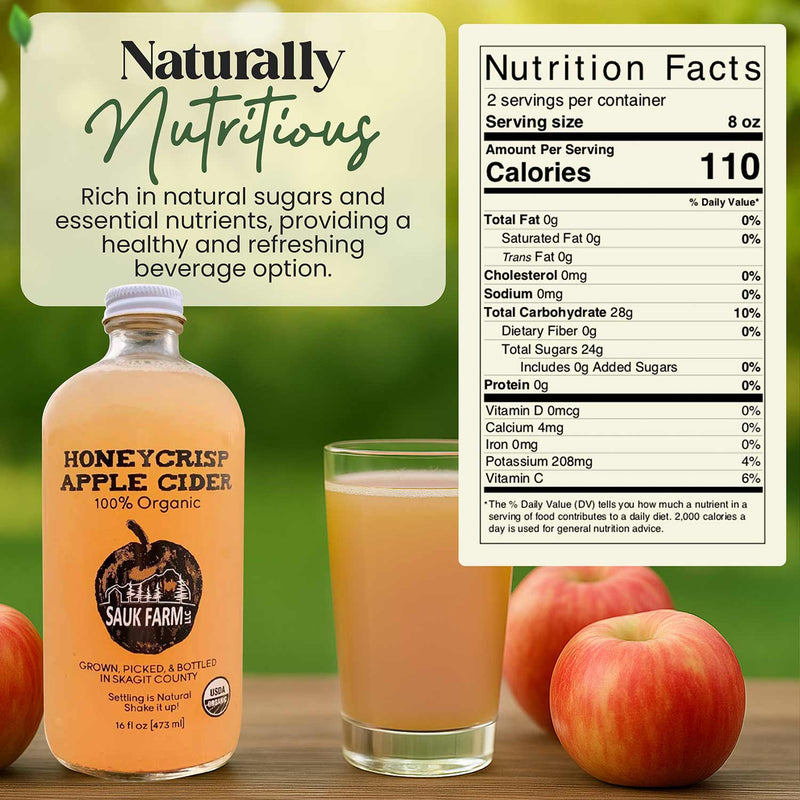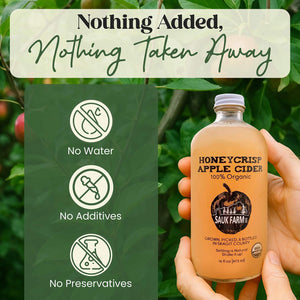 Enjoy the clean, orchard-fresh taste of Sauk Farm Apple Cider—crafted from 100% organic Honeycrisp apples and nothing else. Cold-pressed from fresh, clean fruit with no sugar, no water, and no preservatives added, each bottle holds the juice of 4.5 apples, delivering bold flavor and natural sweetness in every sip.