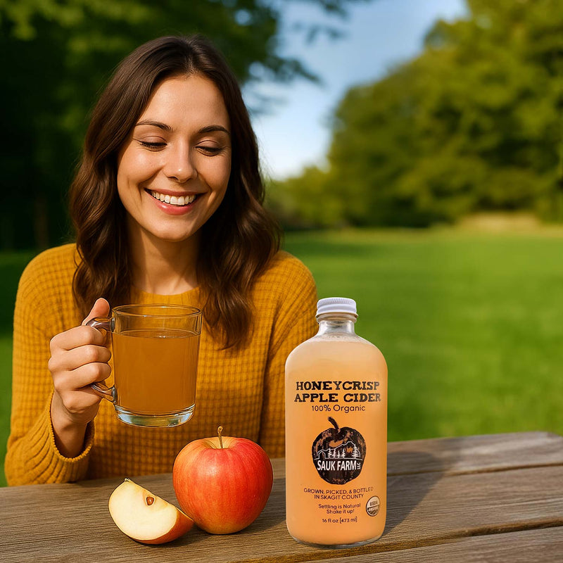 Naturally sweet, never sugary—Sauk Farm Apple Cider is a simple, honest taste of the Skagit Valley in the Pacific Northwest.
