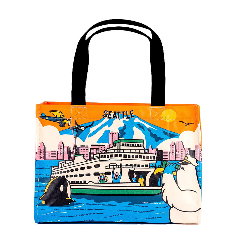 Delightful shopping bags reflecting the Washington state of mind (to locals as well as travelers) by Chalo, Seattle. This roomy, multi-use tote features a whimsical screen printed illustration of a Seattle's Skyline with ferry.